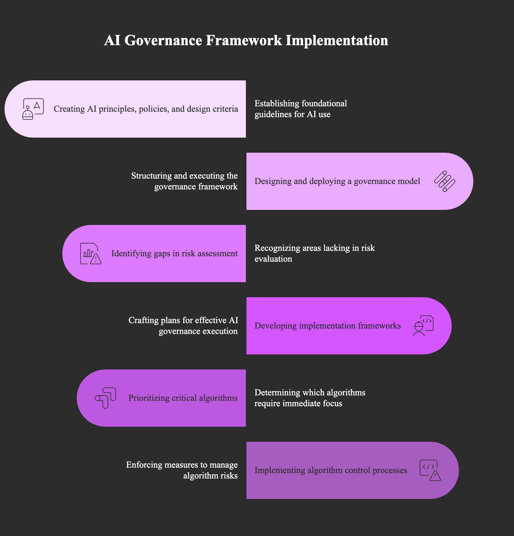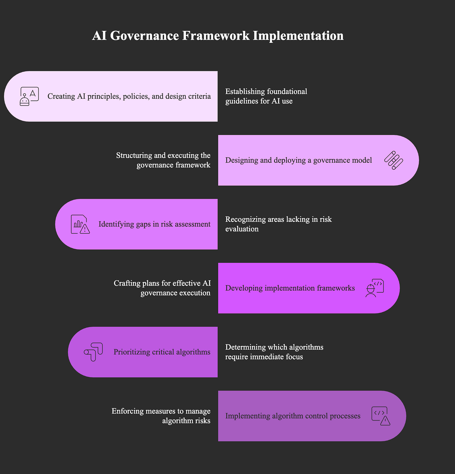 Implementing a practical AI governance framework involves a six-step approach[8]: