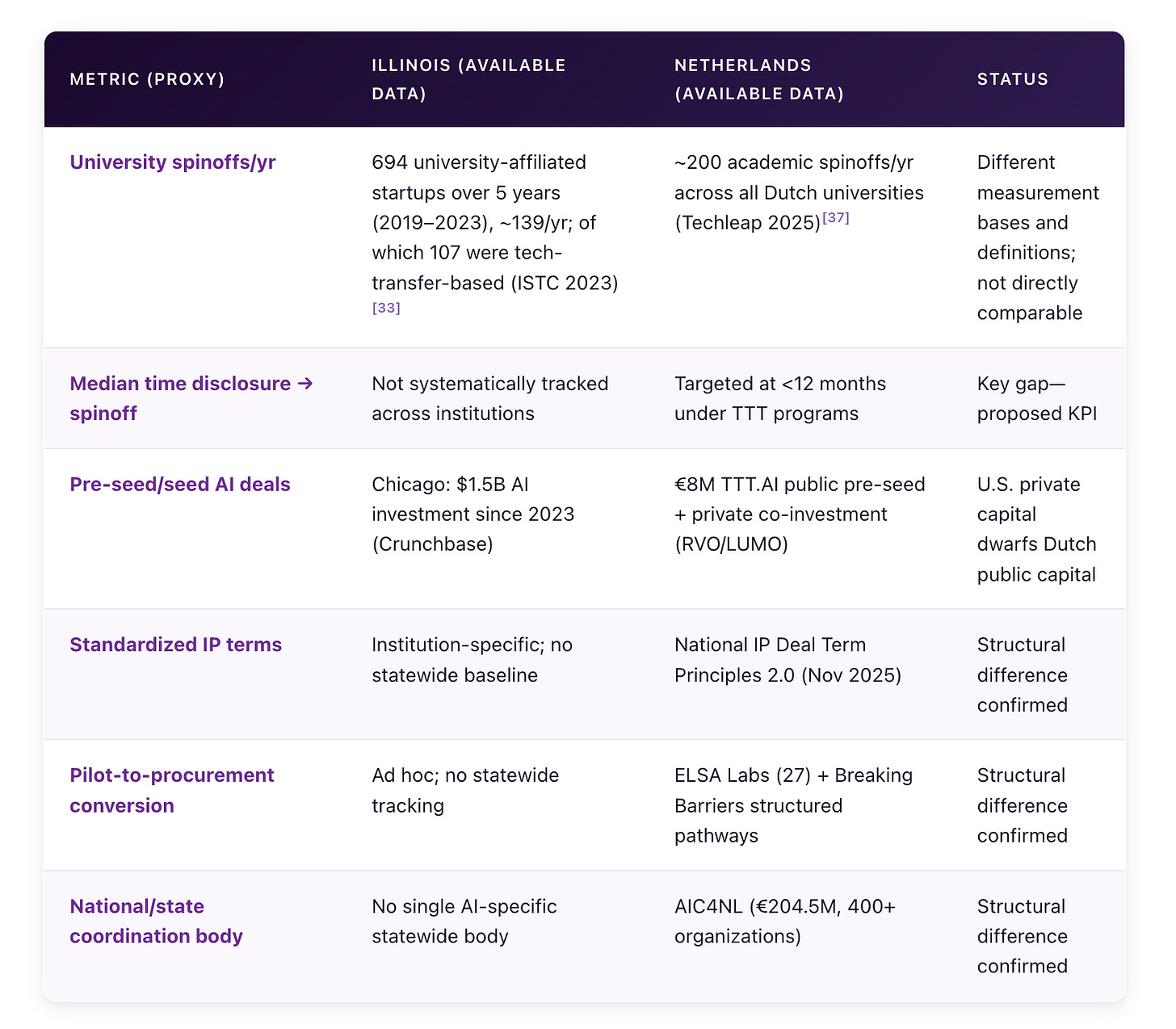 The claim that commercialization outcomes diverge requires specificity. While comprehensive head-to-head data is unavailable, the following proxy metrics highlight structural differences in how each ecosystem organizes commercialization—not simply how much activity occurs. Illinois may generate comparable or greater raw startup volume, but the Dutch system exhibits more standardized, repeatable pathways from lab to market.